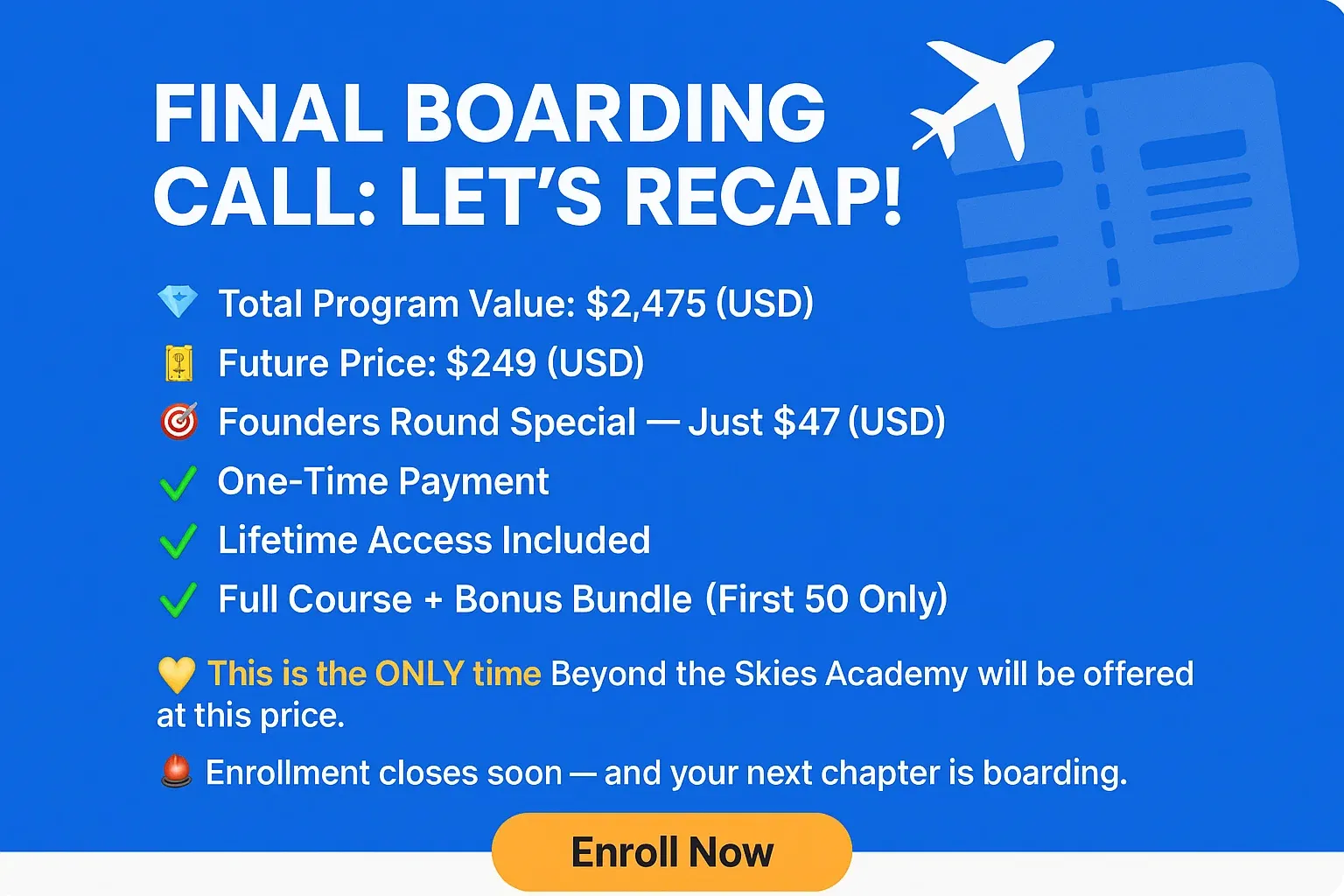That’s why I created Beyond the Skies Academy — so you never have to navigate this transition alone. Together, we’ll make sure your next chapter feels just as exciting and purpose-filled as takeoff day. 🌤️