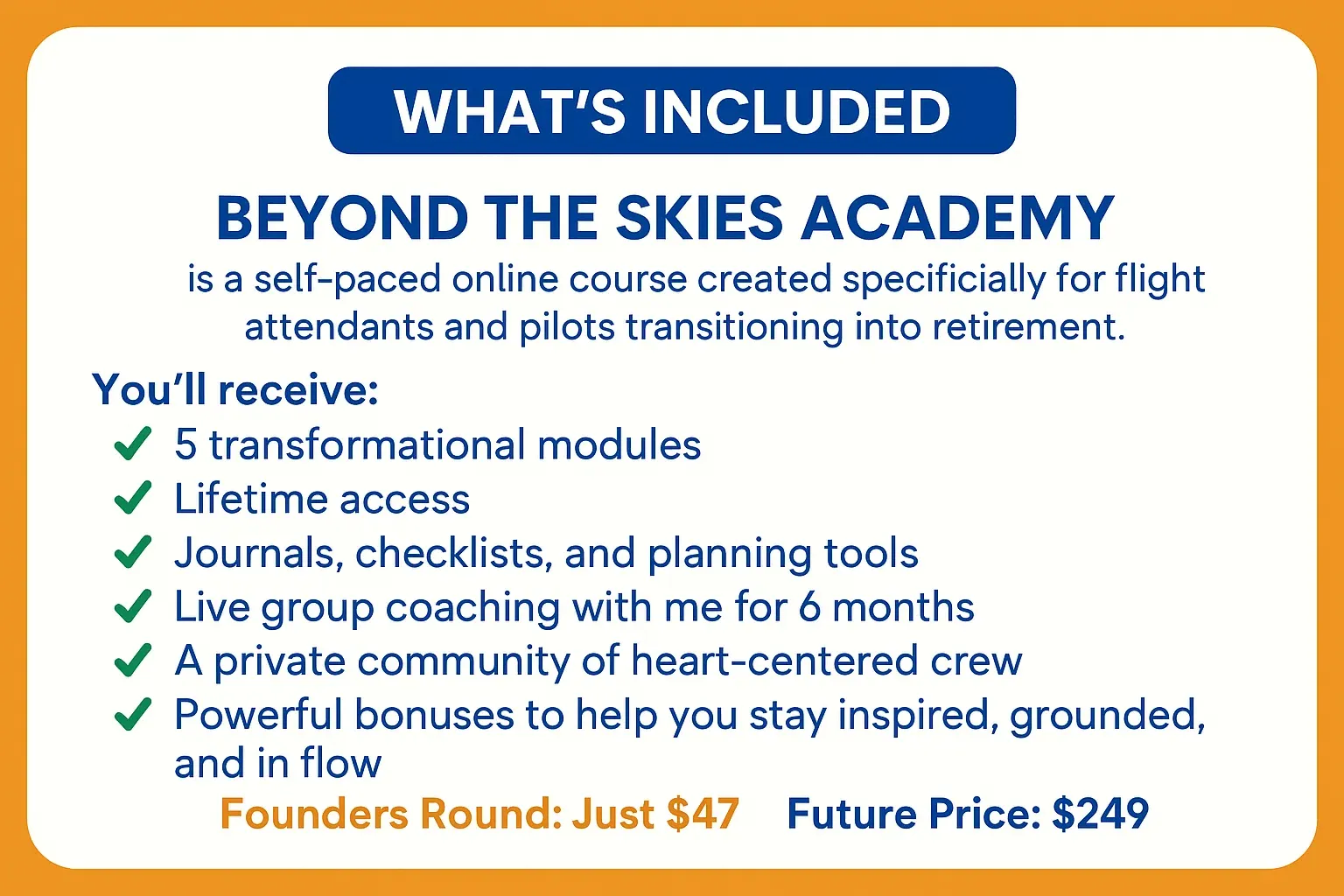 👉 “Join today and get lifetime access to Beyond the Skies Academy — your flight plan for peace of mind, purpose, and a next chapter that feels 100% you.”